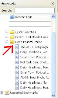 Another option you have is to utilize the “Live Bookmarks” or “Feeds” feature available on browsers such as Mozilla’s Firefox and Microsoft’s Internet Explorer (the Firefox feature is shown at right). This option allows you to view the title of each new post in your bookmarks sidebar. Once you click on the title, it takes you to the Web site so you can view the post you want to see.